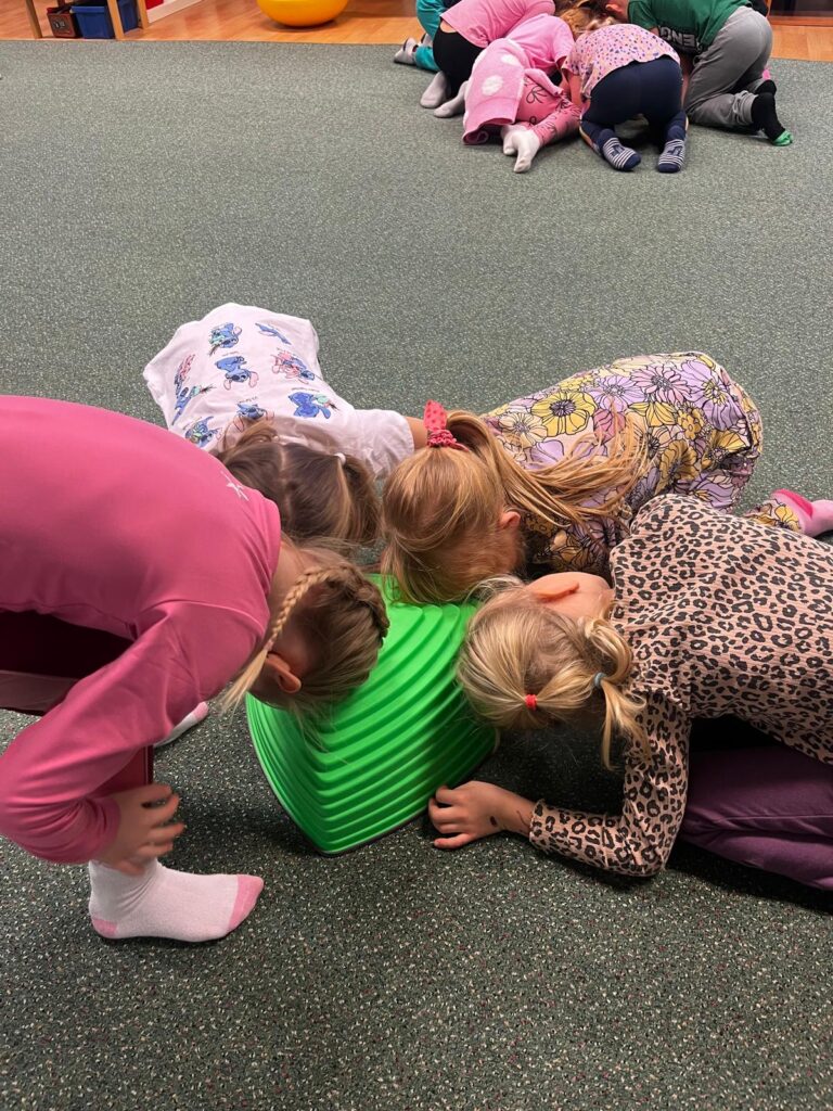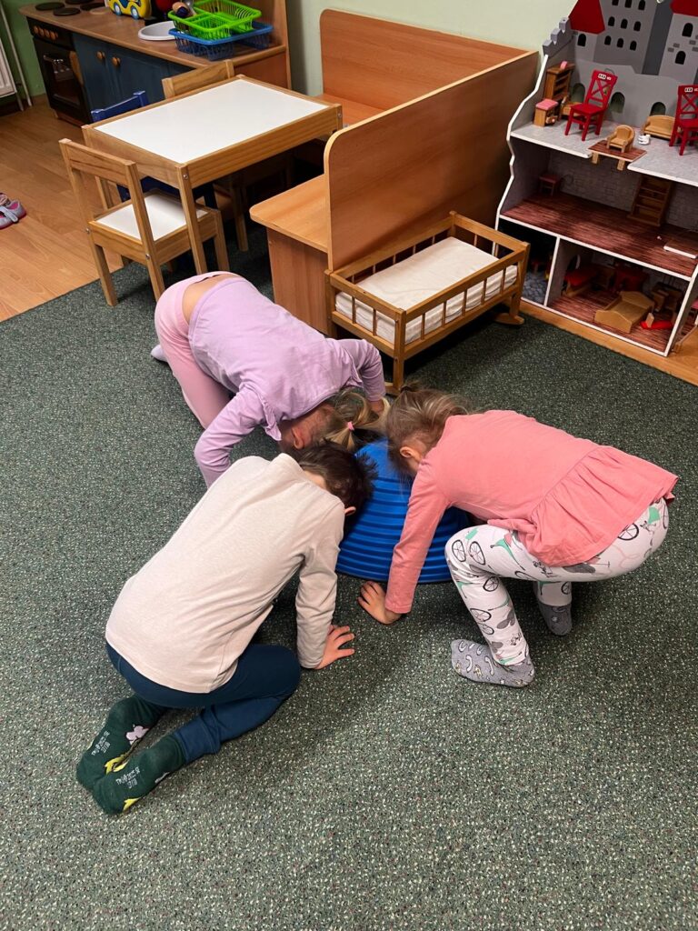 Opičí dráha a tanec s písničkami – hrubá motorika, rovnováha, koordinace, spolupráce.