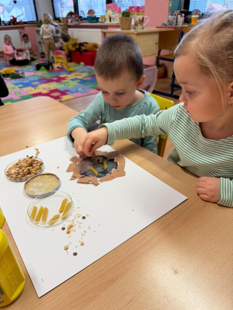 Práce s pinzetami a molitanovými kuličkami – jemná motorika, přesnost, soustředění.